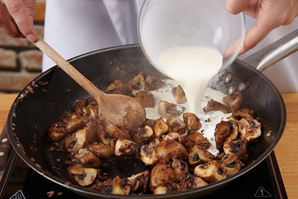 In einer mittleren Pfanne ca. 1EL Pflanzenöl hoch erhitzen. Champignons darin 1-2Min. scharf anbraten. Die Zwiebel hinzugeben und bei mittelhoher Hitze für ca. 3Min. mit anschwitzen. 100ml der Sahne dazugeben und für ca. 3-5Min. leicht köcheln lassen. Die Petersilie unterheben und mit Salz und Pfeffer würzen. Wer's cremiger will, etwas mehr Sahne zugeben.