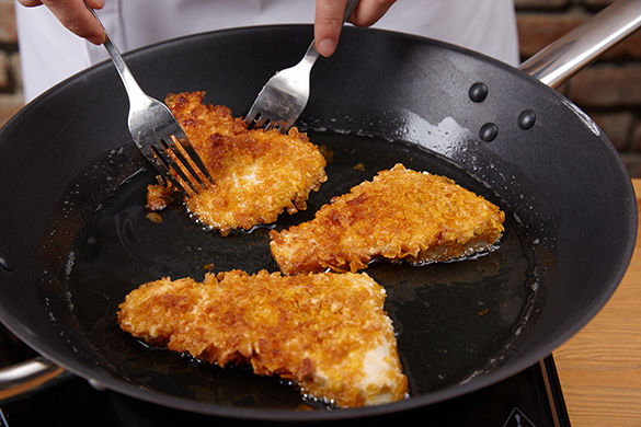 Inzwischen in einer großen Pfanne ca. 1cm hoch Pflanzenöl mittelhoch erhitzen. Die Schnitzel aus der Panade nehmen und einzeln in die Cornflakes drücken, so dass jede Seite ausreichend paniert ist. Nun die Schnitzel von jeder Seite ca. 3Min. goldbraun gar ausbacken. Mit Kartoffeln und Champignons anrichten.
