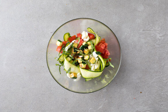 Die Zucchinistreifen mit dem geschnittenen Basilikum sowie den Tomaten-, Zucchini- und Mozzarellawürfeln, 2EL Kräuteröl und 1EL Essig vermengen. Mit Salz und Pfeffer abschmecken.