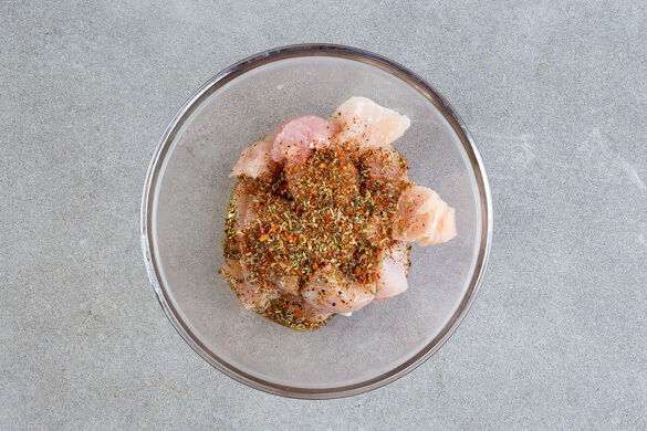 Das Fleisch trocken tupfen, in mundgerechte Stücke schneiden und mit der Gewürzmischung und 1EL Olivenöl vermengen.