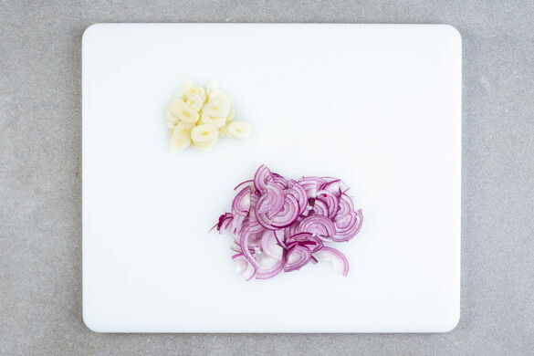 In einem mittelgroßen Topf ausreichend gesalzenes Wasser für die Pasta zum Kochen bringen. Die Zwiebel und den Knoblauch schälen, halbieren und in dünne Scheiben schneiden.