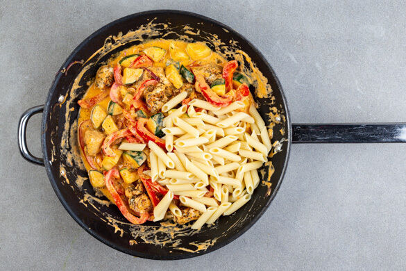 Zeit, die man mit Pasta verbringt, ist gute Zeit. Und damit wir nachher mehr davon haben, kochen wir einfach ganz schnell: Während die Penne brodeln, braten wir fix all’italiana gewürztes Hähnchen, frische Zucchini und Paprika. Dann kommt die Geheimwaffe: ein lecker-aromatisches Pesto aus getrockneten Tomaten und Oliven. Noch etwas Crème fraîche hineingerührt, Pasta dazu und schon ist aufgetischt. Buon appetito!