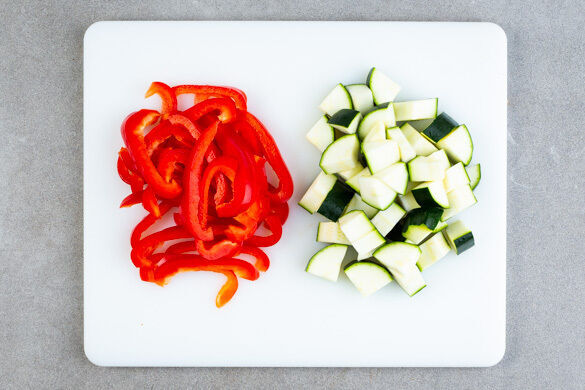 Die Zucchini längs vierteln und in ca. 1cm große Würfel schneiden. Die Paprika vierteln, entkernen und in dünne Streifen schneiden.