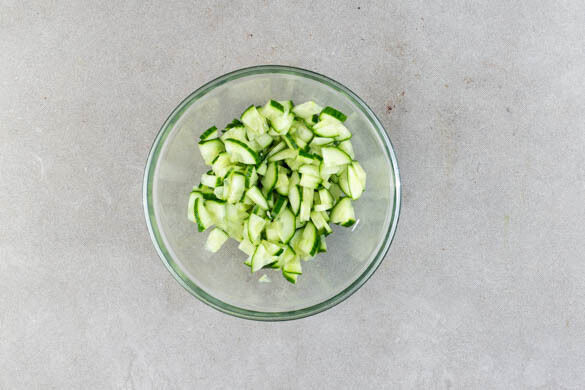 Die Gurke längs vierteln und quer in dünne Scheiben schneiden. Mit 1TL Essig und 1 Prise Salz vermengen.