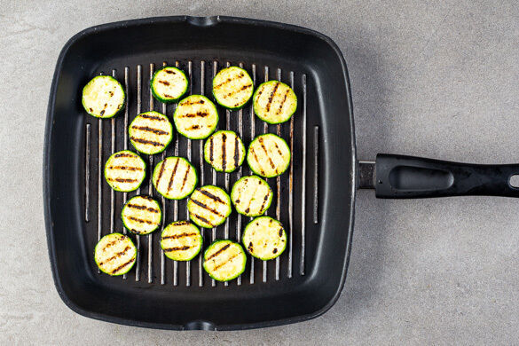 Die Zucchini in dünne Scheiben schneiden, mit etwas Olivenöl bepinseln und in einer Grillpfanne oder einer normalen Pfanne verteilen, sodass die Zucchinischeiben nicht überlappen. Je nach Größe der Pfanne in zwei Durchgängen arbeiten. Die Zucchini bei starker Hitze auf jeder Seite 1–2Min. goldbraun grillen oder braten und nach Geschmack mit Salz und Pfeffer würzen.
