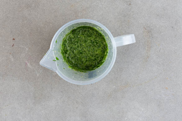 Die Zitronenschale abreiben, dann die Zitrone halbieren und auspressen. Das hohe Gefäß ausspülen und die Kräuter mit 4TL Zitronensaft, 5EL Olivenöl, 2EL Wasser und 1 kräftigen Prise Salz fein pürieren. Die Kräutersauce mit der Zitronenschale abschmecken.
