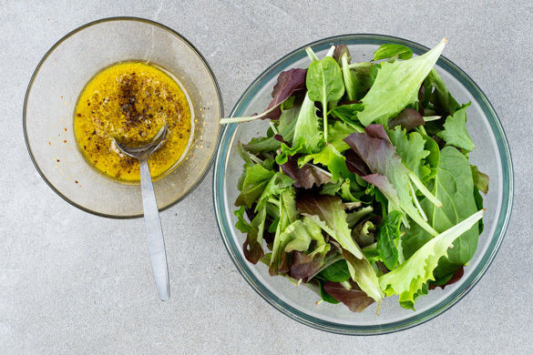 Aus 2EL Olivenöl, 2EL Essig, 1½EL körnigem Senf sowie je 1 kräftigen Prise Salz und Pfeffer ein Dressing anrühren. Den Salat kurz vor dem Servieren mit dem Dressing vermengen.