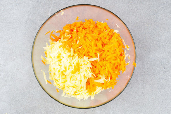 Den Backofen auf 220°C (200°C Umluft) vorheizen. Die Karotten und die Kartoffeln schälen und mit einer Küchenreibe grob raspeln. Mit ½–1TL Salz mischen und ca. 5Min. ruhen lassen.