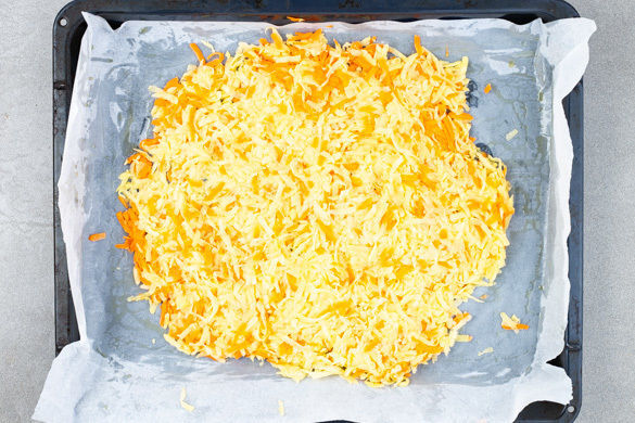 Den Backofen auf 220°C (200°C Umluft) vorheizen. Die Karotte und die Kartoffeln schälen und mit einer Küchenreibe grob raspeln. Mit ½TL Salz mischen und ca. 5Min. ruhen lassen.