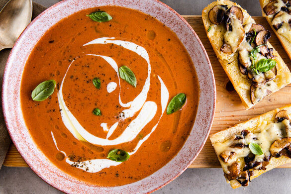 Tomatensuppe: Duftende, farbenfrohe Kindheitserinnerung, gesunder Sattmacher und herzhafter Seelenwärmer! Crème fraîche und frisches Basilikum sind die kontrastreichen i-Tüpfelchen, die das schöne Bild vollenden. Dazu reichen wir knusprige Baguettes mit gebratenen Champignons und leckerem Käse. Auf die Plätze, Löffel, los!