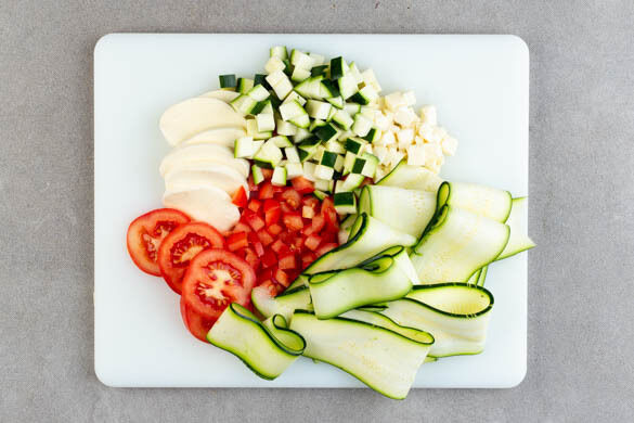 Den Backofen auf 200°C (180°C Umluft) vorheizen. Den Mozzarella in dünne Scheiben schneiden, 8 Scheiben beiseitelegen, die restlichen Scheiben würfeln. 8 Tomatenscheiben abschneiden, ebenfalls beiseitelegen und die restlichen Tomaten würfeln. Die Zucchini mit einem Sparschäler in feine Streifen schneiden, das Kerngehäuse auslassen und in Würfel schneiden.