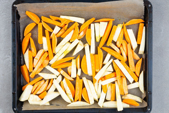 Die Gemüsepommes auf einem zweiten mit Backpapier ausgelegten Backblech verteilen, mit 3EL Olivenöl vermengen und 20–25Min. im Ofen backen.
