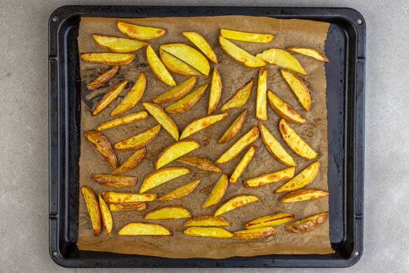 Die Pommes aus dem Ofen nehmen und mit dem Käse bestreuen, dann zurück in den Ofen geben und weitere 3–5Min. backen, bis der Käse geschmolzen ist.