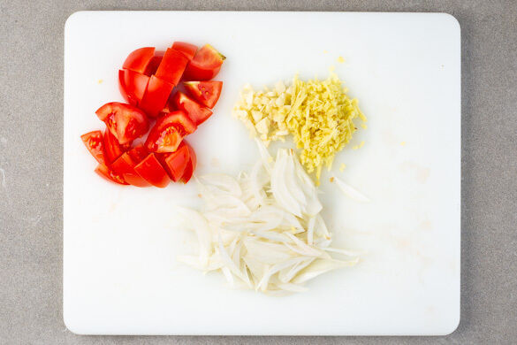 Den Ingwer und den Knoblauch schälen und fein reiben. Die Zwiebeln schälen, halbieren und in feine Streifen schneiden. Die Tomaten vierteln und in 1–2cm große Stücke schneiden. In einem mittelgroßen Topf ausreichend gesalzenes Wasser für die Nudeln aufkochen.