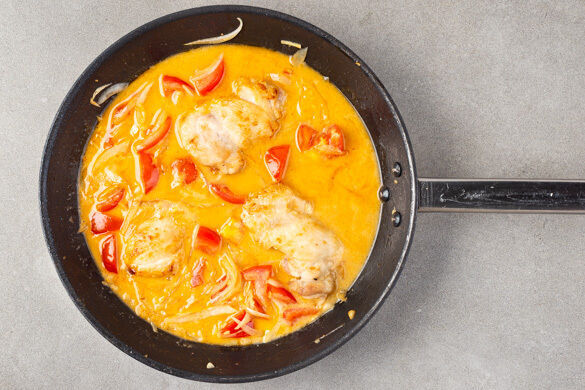 Das Gemüse mit der Kokosmilch, der Sojasauce und 200ml Wasser ablöschen. Die Sauce zum Kochen bringen, dann das Fleisch zurück in die Pfanne geben und bei mittlerer Hitze in 12–15Min. gar kochen. Mit Salz und Pfeffer abschmecken.
