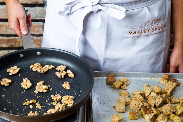 Inzwischen die Walnüsse in einer kleinen Pfanne ohne Zugabe von Fett bei mittlerer Hitze 3–4Min. anrösten. Vom Herd nehmen und beiseitestellen. Das Brötchen in 1–2cm große Stücke schneiden oder zupfen und mit 1–2TL Olivenöl sowie Salz und Pfeffer würzen. Die Brötchenstücke auf einem Backblech verteilen und im Ofen 8–10Min. rösten, bis sie knusprig sind.
