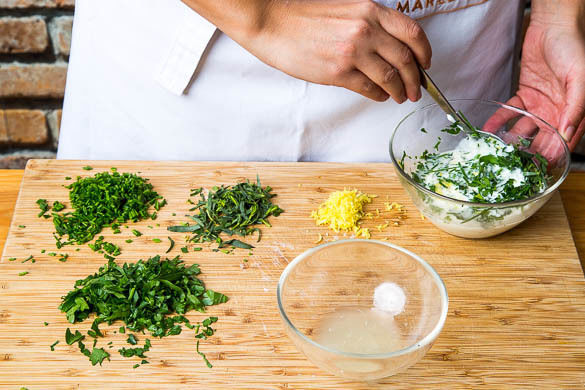 Die Zitronenschale abreiben, dann die Zitrone halbieren und auspressen. Die Petersilienblätter abzupfen und fein schneiden. Den Schnittlauch in feine Röllchen schneiden. Die 1/2 der Kräuter mit dem Joghurt, 1–2EL Zitronensaft, 1EL Zitronenabrieb und 1EL Olivenöl zu einem Dressing verrühren und mit Salz und Pfeffer abschmecken.
