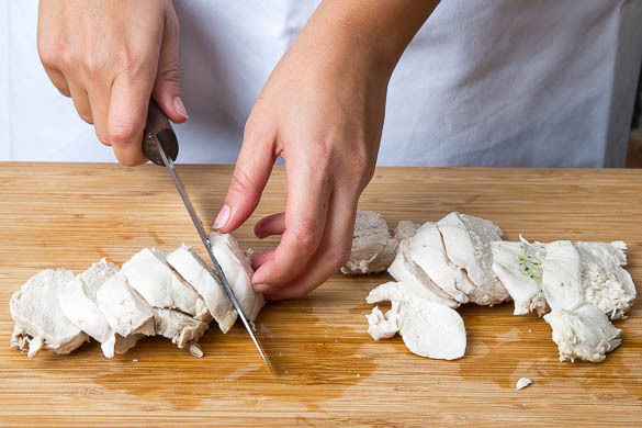 Den Knoblauch schälen und 2–3Min. in das kochende Wasser geben. Das Fleisch trocken tupfen, hinzugeben und ca. 3Min. mitkochen. Dann bei niedriger Hitze abgedeckt noch 12–14Min. ziehen lassen, bis das Fleisch gar ist. In ein Sieb abgießen und beiseitestellen.