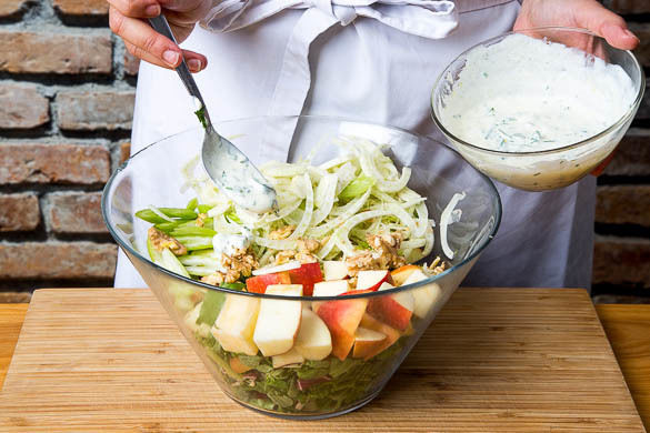 Die Apfelstücke, den Sellerie und den Fenchel mit dem gemischten Salat vermengen. Die 1/2 der Walnüsse und ca. 2/3 des Dressings untermischen. Den Salat auf Teller verteilen.