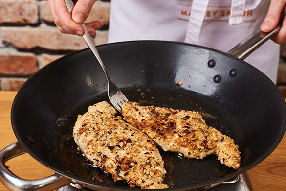 Das Fleisch mit etwas Küchenkrepp trocken tupfen, dann zwischen zwei Lagen Frischhaltefolie mit einem Fleischklopfer oder Boden einer schweren Pfanne flach klopfen und nacheinander in etwas Mehl, 1 verquirltem Ei und der Nussmischung panieren.