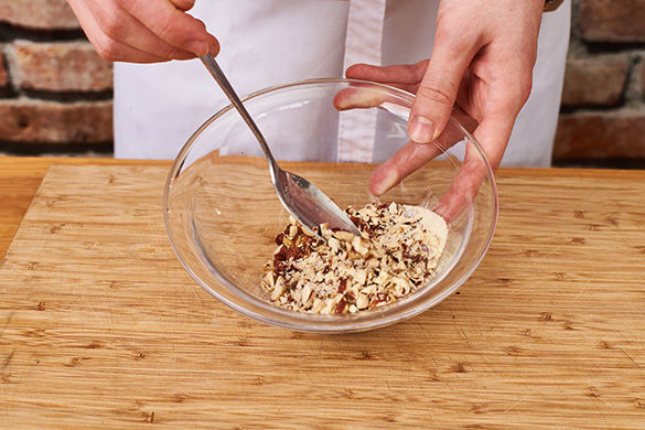 Die Haselnüsse fein hacken und mit den Semmelbröseln sowie 1–2EL Olivenöl vermengen. Mit Salz und Pfeffer würzen.