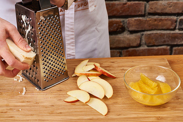 Ca. 1TL Orangenschale abreiben, dann die Orange rundherum schälen und in mundgerechte Stücke schneiden, dabei den Saft auffangen. Die Äpfel vierteln, entkernen und in dünne Scheiben schneiden. Die 1/2 des Selleries schälen und fein raspeln oder in feine Stifte schneiden. Mit den Äpfeln sowie etwas Salz und Essig vermengen, beiseitestellen und ziehen lassen.