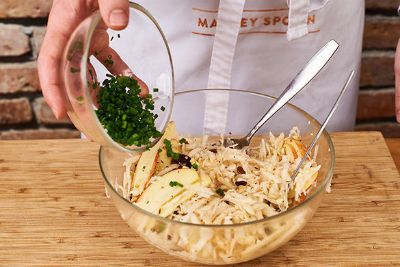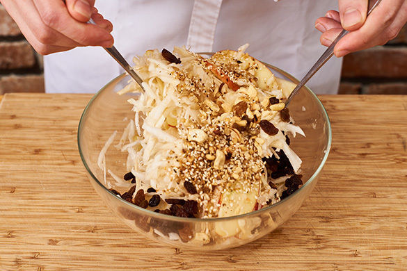 Die Sellerie-Apfel-Mischung mit den Orangenfilets, dem Orangensaft, der Orangenschale, den Rosinen und der Gewürzmischung vermengen. Mit 2–3EL Olivenöl sowie Salz und Pfeffer abschmecken.
