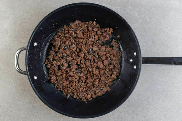 Das Hackfleisch in einer großen Pfanne mit 2EL Pflanzenöl bei starker Hitze 2–4Min. krümelig anbraten.