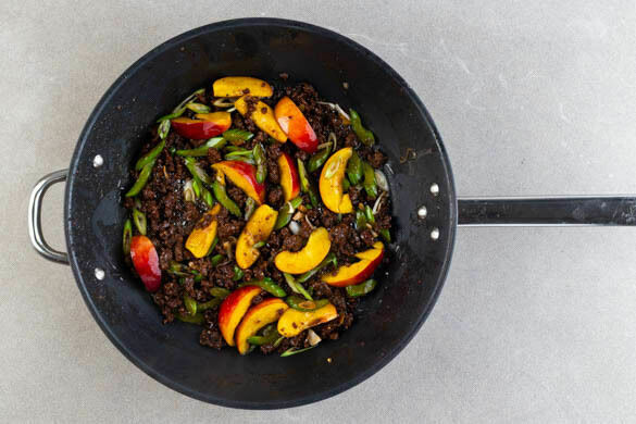 Den Sellerie und den Knoblauch dazugeben und 2–3Min. bei mittlerer Hitze mitbraten. Mit der Teriyakisauce ablöschen und die Nektarinenscheiben sowie die ½ der Lauchzwiebeln untermengen. Mit Salz und Pfeffer abschmecken.