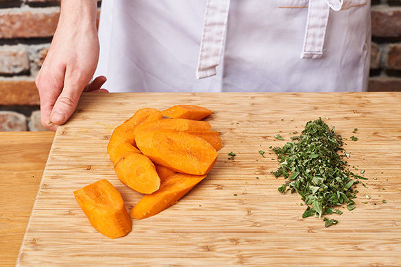 Den Backofen auf 180°C Umluft (200°C Ober-/Unterhitze) vorheizen. Die Karotten schälen und schräg in 2–3cm große, mundgerechte Stücke schneiden. Die Rosmarinnadeln und die Oreganoblätter von den Stängeln zupfen und fein schneiden.