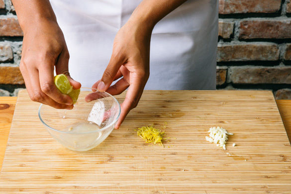 Den Knoblauch schälen und grob würfeln. Die Zitronenschale abreiben, dann die Zitrone halbieren und auspressen.