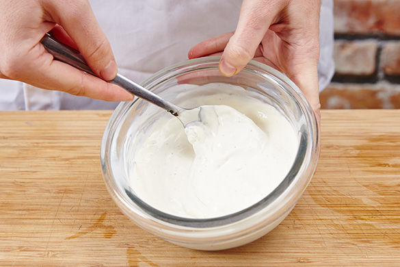 Den Schmand in einer Schüssel mit Salz und Pfeffer abschmecken. 6 Scheiben Brot toasten. Wer keinen Toaster hat, kann das Brot wahlweise im Backofen oder in einer Pfanne ohne Öl toasten.