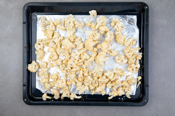 Den Blumenkohl auf einem mit Alufolie ausgelegten Backblech verteilen und im Ofen ca. 8Min. grillen, bis die Blumenkohlröschen an den Rändern goldbraun sind. Den Blumenkohl wenden und erneut ca. 8Min. grillen. Die Ofentür dabei mit einem Holzlöffel offen halten, damit die Feuchtigkeit entweichen kann. Den Blumenkohl anschließend im ausgeschalteten Ofen warm halten.