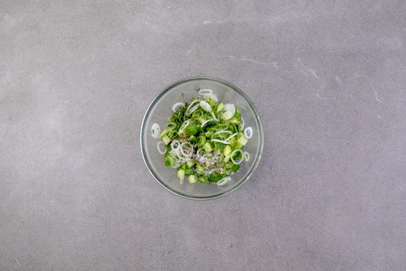 Die Kresse mit einer Küchenschere vom Beet schneiden. Die Lauchzwiebel in feine Ringe schneiden. Die Gurke in ca. 0,5cm kleine Würfel schneiden. Die Kresse, die Lauchwiebeln und die Gurkenwürfel mischen und mit Salz und Pfeffer würzen. Den Tandoori-Blumenkohl mit dem Brot, dem restlichen Joghurt und den Limettenspalten garniert servieren.