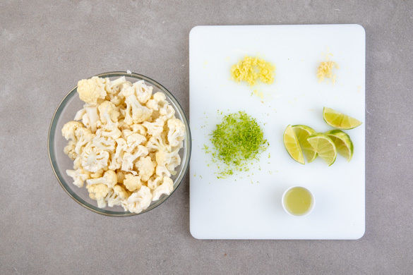 Den Backofen mit Grillfunktion auf 250°C vorheizen. Den Blumenkohl in 1–1,5cm große Röschen schneiden. Den Ingwer schälen und fein reiben. Den Knoblauch schälen und fein würfeln. Die Limettenschale abreiben und die Limetten halbieren, zwei Hälften auspressen, die übrigen Hälften in Spalten schneiden.