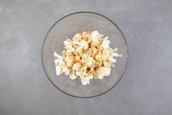 100g Joghurt in einer großen Schüssel mit der Gewürzmischung, 1–2EL Pflanzenöl sowie Salz und Pfeffer verrühren. Den Blumenkohl, den Ingwer, den Knoblauch, die Limettenschale nach Geschmack und den Limettensaft hinzugeben und alles gut vermengen.