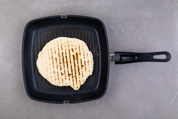 Aus den Teigkugeln je einen ca. 1cm dicken Fladen formen. Der Teig sollte nicht kleben, ggf. etwas mehr Mehl verwenden, um ihn besser formen zu können. Die Fladen einzeln in einer Grillpfanne auf jeder Seite ca. 2Min. knusprig braten, bis das Brot durchgegart ist. Tipp: Wer keine Grillpfanne hat, kann eine normale Pfanne mit 1TL Pflanzenöl verwenden.