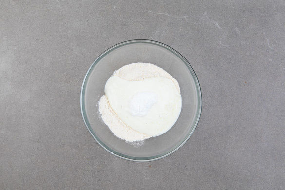 Das Mehl mit 2 Bechern Joghurt, 2TL Backpulver und 1–2 kräftigen Prisen Salz zu einem glatten Teig verkneten. Den Teig vierteln und zu 4 etwa gleich großen Kugeln formen. Eine Grillpfanne stark erhitzen.