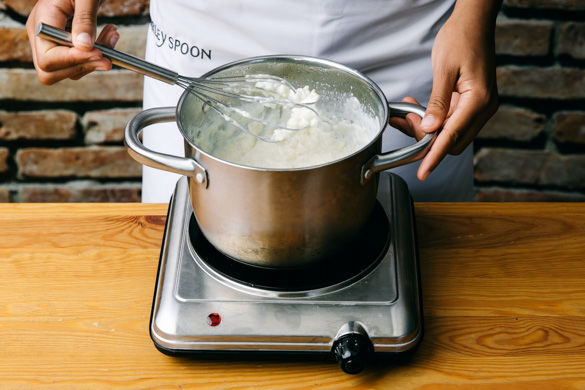 Die Milch mit 400ml Wasser in einem mittelgroßen Topf zum Kochen bringen. Vorsicht, die Milch darf nicht überkochen oder anbrennen. Sobald sich kleine Bläschen bilden, die Milch nicht aus den Augen lassen.