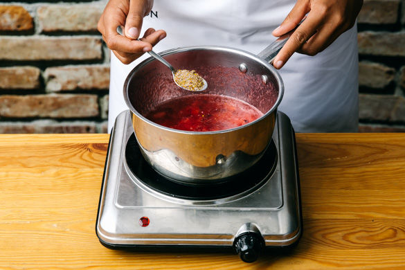 Die Pflaumenwürfel mit 1–2EL Zucker, 2EL Zitronensaft und 2–3EL Wasser in einem kleinen Topf bei mittlerer Hitze 2–4Min. sanft köcheln lassen. Das Kompott mit 1–2TL Blütenmischung nach Geschmack verfeinern.