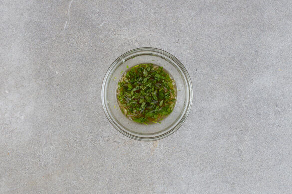 Den Limettensaft mit ½EL Fischsauce, 1EL der Kräuter, 1–2TL Wasser, ½TL Salz und 1TL Zucker verrühren. Das Dressing nach Geschmack mit mehr Fischsauce und ggf. Essig würzen.