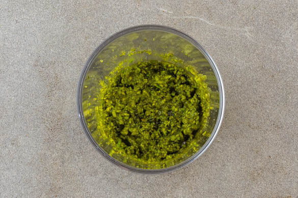 Inzwischen die Pistazienkerne mit 2EL Olivenöl in einem hohen Gefäß möglichst platt pürieren und mit je 1 kräftigen Prise Salz und Pfeffer würzen.