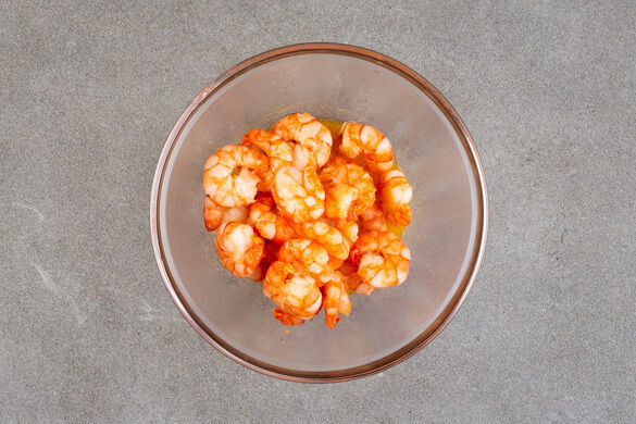 Die Garnelen in einer großen Pfanne mit 2TL Olivenöl bei mittlerer bis starker Hitze 2–3Min. ohne Rühren anbraten. Die Garnelen anschließend wenden und weitere 10–15Sek. braten, dann aus der Pfanne nehmen und beiseitestellen.