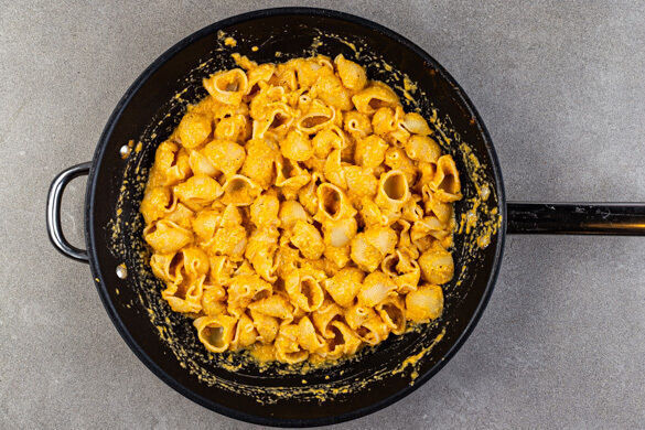 1 Tasse kochendes Wasser aus dem Topf schöpfen, über die Cashews gießen und die Cashews zum Einweichen beiseitestellen. Die Pasta in das kochende Wasser geben und in 9–11Min. bissfest kochen. 1 Tasse Pastawasser abschöpfen, dann die Pasta in ein Sieb abgießen und abtropfen lassen.