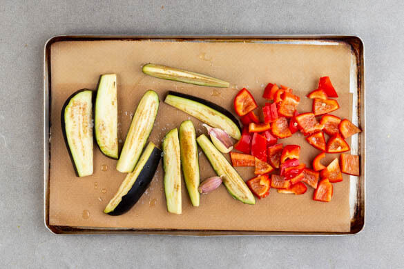 Den Backofen auf 200°C (180°C Umluft) vorheizen. Die Paprika jeweils vierteln, entkernen und in ca. 2cm große Stücke schneiden. Die Auberginen längs in ca. 4cm lange Spalten schneiden. Das Gemüse auf einem oder zwei mit Backpapier ausgelegten Backblech(en) mit 3EL Olivenöl und 1TL Salz vermengen. Den Knoblauch samt Schale dazugeben und alles im Ofen ca. 15Min. backen.