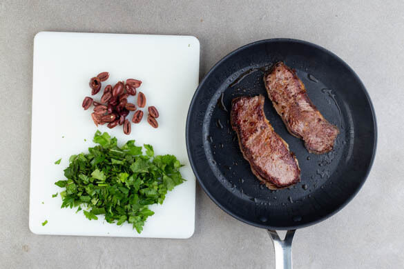 Die Brötchen auf einem Backrost 6–8Min. im Ofen aufbacken. Die Oliven längs halbieren. Die Kräuter samt Stängeln grob schneiden. Das Fleisch trocken tupfen. In einer großen Pfanne 1EL Olivenöl stark erhitzen. Das Fleisch in das heiße Öl geben, mit je 1 Prise Salz und Pfeffer würzen und bei starker Hitze auf jeder Seite 1–2Min. braun anbraten.