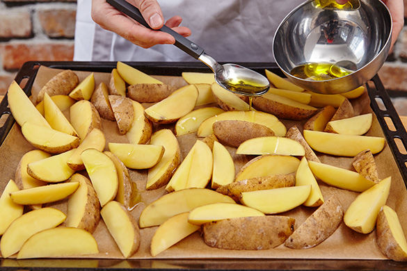 Den Backofen auf 200°C Umluft oder 220°C Ober-/Unterhitze vorheizen. Die Kartoffeln samt Schale in ca. 2cm dicke Spalten schneiden. Auf einem mit Backpapier ausgelegten Backblech mit 1-2EL Öl, 1 Prise Salz und Pfeffer vermengen und im Ofen ca. 20-30Min. goldbraun backen. Nach der Hälfte der Zeit einmal wenden.