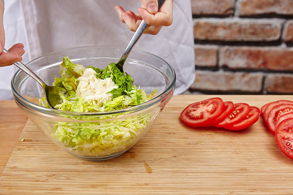 Die Tomaten in dünne Scheiben schneiden. Die Hälfte des Romanasalats in feine Streifen schneiden und in einer Schüssel mit der Mayonnaise und 1EL Crème fraîche vermischen, mit Salz und Pfeffer würzen. Den restlichen Salat als Beilagensalat mit 1-2EL Öl, 1EL Essig, Salz und Pfeffer anmachen.