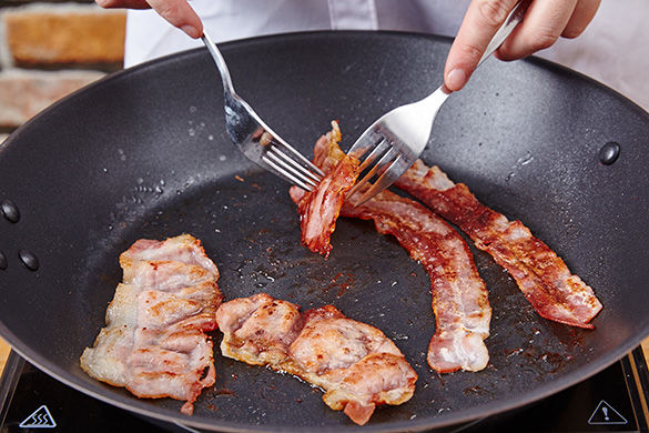 Währenddessen in derselben Pfanne die Baconscheiben bei mittlerer Hitze ca. 2-3Min. kross braten. Aus der Pfanne nehmen und auf einem Stück Küchenkrepp abtropfen lassen.