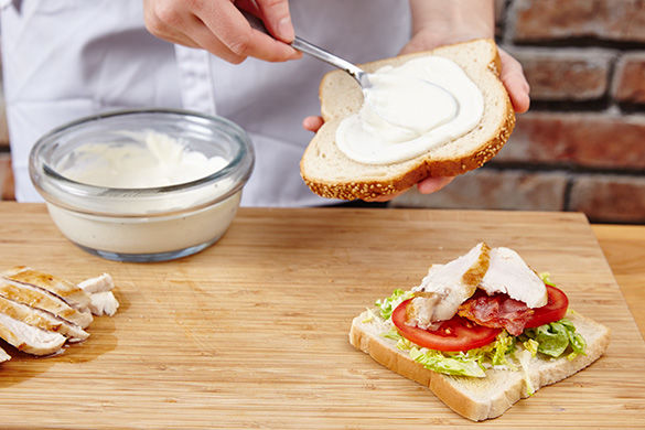 Nun die Sandwiches aus 2 mal 3 Scheiben Brot für die erwachsenen und 2 mal 2 Scheiben Brot für die Kinder bauen. Dafür das Brot mit etwas Creme bestreichen, mit Tomaten, Mayonnaise-Salat, Bacon und Hähnchen belegen. Die Sandwiches mit den Kartoffelwedges, der restlichen Creme und dem Beilagensalat anrichten und servieren.